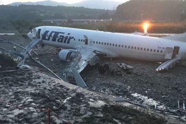 «Самолет Boeing 737-800 с бортовым номером VQ-BJI, следующий рейсом UT579 Москва — Сочи, после посадки выкатился за пределы взлетно-посадочной полосы. Воздушное судно скатилось в русло реки, в результате чего разрушились стойки шасси и крыло, произошло возгорание левого двигателя. На борту самолета находились 164 пассажира и шесть членов экипажа. Пожарные расчеты аэропорта Сочи потушили возгорание, людей эвакуировали. Жертв нет. Авиакомпания и авиационные власти начали расследование причин случившегося», — рассказали в авиакомпании.