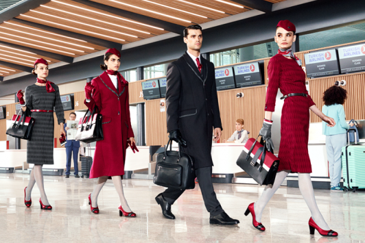 Новый дизайн формы бортпроводников Turkish Airlines создал миланский кутюрье Этторе Билотта. Коллекция в темно-красной и антрацитово-серой палитре включает в себя шляпы, перчатки, платья, костюмы, сумки и аксессуары.